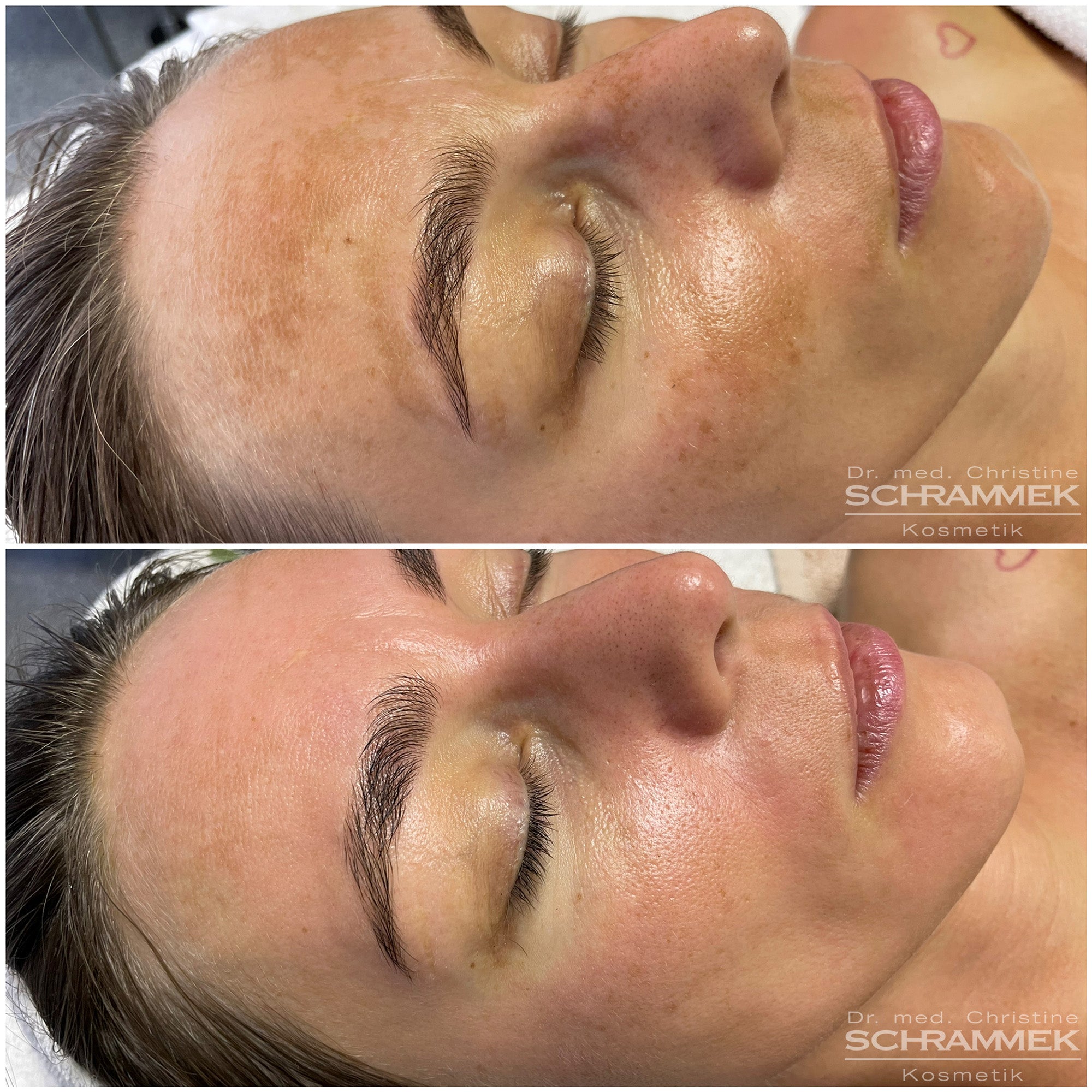 Pigmentation spots cause the skin to become darker and uneven. This gives the skin a darker overall older appearance. For best results, the treatment is carried out over several times with lighter pressure and without the peeling effect. Following each Green Peel treatment, the brightening mask is applied. Special aftercare products are included and recommended between treatment times.